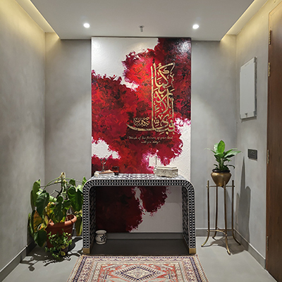 The entryway makes a bold statement with red and white abstract artwork accented by gold calligraphy, paired with an inlaid console table that adds texture and elegance.