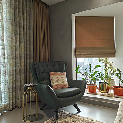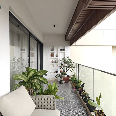 The balcony serves as a lush outdoor retreat with patterned tiles, greenery, cozy seating, and a warm wooden ceiling.