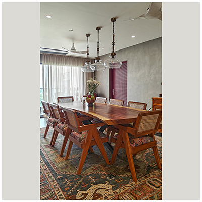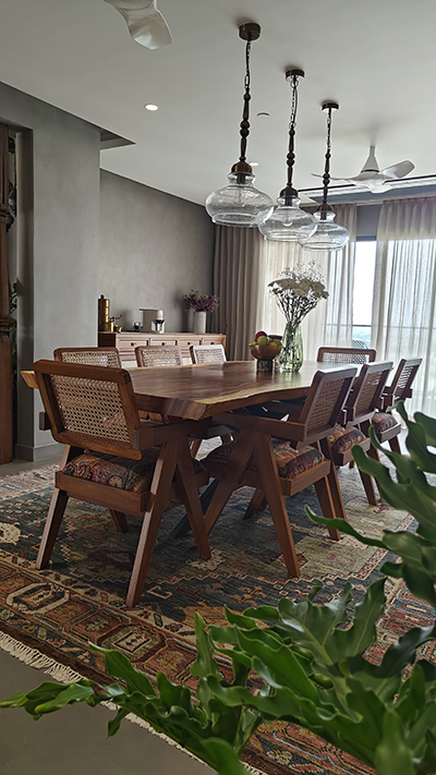 The dining area features a dark wood table, woven cane-back chairs, and a modern pendant light, creating a warm, inviting space with characterful accents.