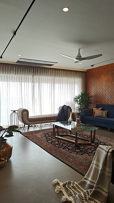 A herringbone-patterned accent wall adds depth to the living room, balanced by muted grey walls and a crisp white door for contrast.