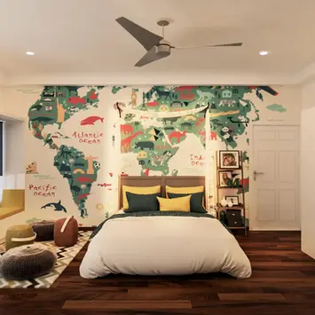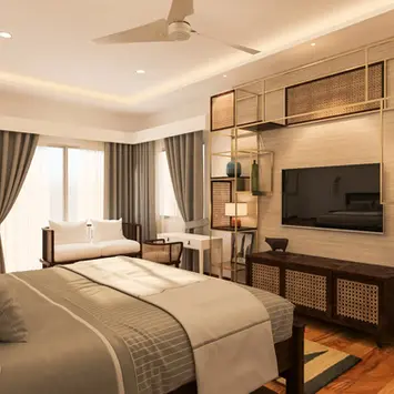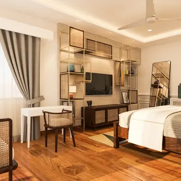 This semi-contemporary duplex home is a perfect blend of soothing, fresh interiors that radiate simplicity and elegance. The design embraces an all-white color palette, allowing the contrast of brass metal accents, natural wood, and intricate cane weave to bring warmth and character to the space. The interiors are minimalistic, with clean lines and an uncluttered feel that creates a sense of openness and calm.
